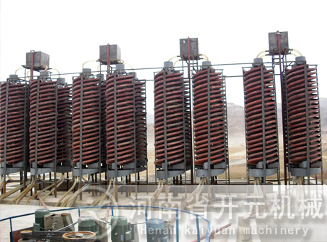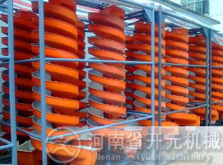 將螺旋溜槽通過螺旋支架立起,校準垂直線,用鐵架固定在合適的位置,由砂泵將礦砂送到螺旋上頂兩個進料口處,加入補充水,調節礦槳濃度,礦槳自然從高往下旋流,在旋轉的斜面流速中產生一種慣性的離心力,以礦砂的比重、粒度、形狀上的差異,通過旋流的重力和離心力的作用,將礦與砂分開,精礦流入精礦斗用管道接出,尾砂流進尾砂斗用管道接到砂池,再用砂泵排走,完成了選礦的全過程